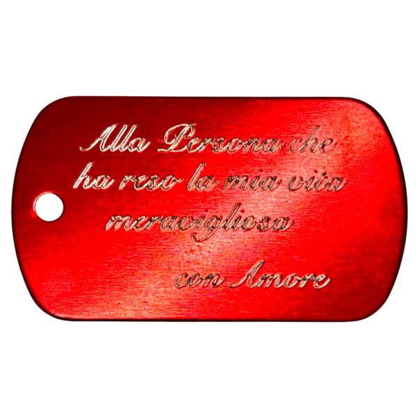 Questo servizio ti permette di richiedere un’incisione avanzata sul retro della tua piastrina: frasi più lunghe, dediche articolate, testi su più righe o caratteri speciali.